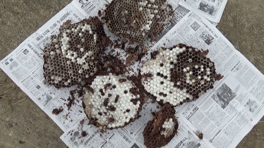 撤去した巣を観察すると、雄蜂や新女王蜂も巣の中にいて繁殖期を迎えていることがわかりました。これらの一連の様子を動画で紹介します。