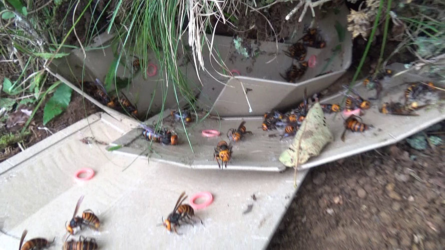 巣に戻ってきたオオスズメバチがいっぱい飛び回り、攻撃してきます。それを粘着板で捕虫します。