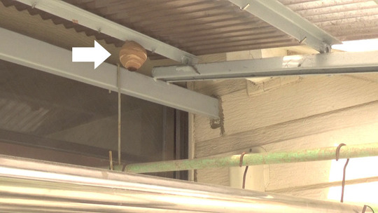 現場は、電話で状況を聞いて思い浮かべた状況と一致していました。コガタスズメバチはベランダの天井の鉄骨にぶら下がるように巣を作っていました。コガタスズメバチの女王蜂が作り上げた巣は、逆とっくり型になるのですが、巣の先端の細い筒がまだ完成されていませんでした。