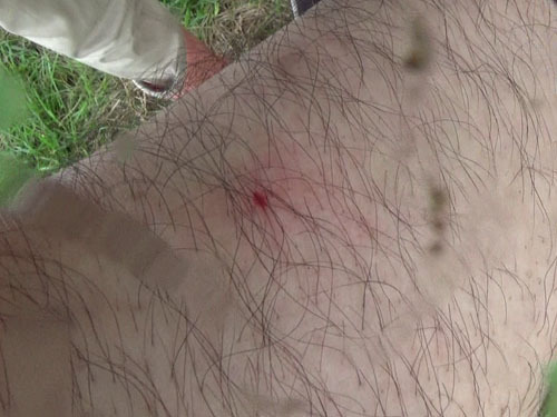防護服を脱いで、刺された右ひざの状況を確認しました。オオスズメバチに刺された部分が血がにじんでポチっとなっていたので、すぐに刺された傷口がわかりました。