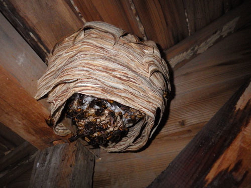 樹洞、屋根裏、軒裏天井、壁の中、土中、物置内部の天井、堆積した稲わらの中、棚の中など閉鎖的な場所に巣を作ることが多いスズメバチです。まれに橋の下や家屋の軒下などの開放的な場所に巣を作ることもあります。