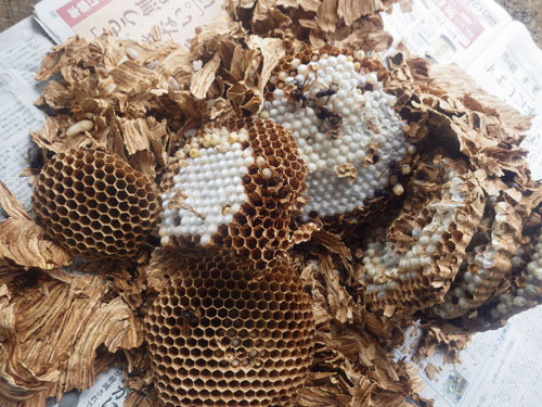 大きい繭にモンスズメバチの新女王蜂と雄蜂の蛹が入っています(9月下旬)