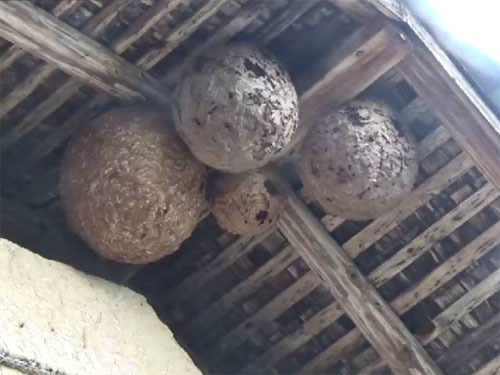 女王蜂が巣を最初から天井裏などの広い空間に作った場合は巣を引越すことなく、そのまま巨大化してゆきます。キイロスズメバチの巣はウロコ状の外皮で覆われた卵形のものが多いですが、巣をつくる場所に合わせた形のものも作ります。