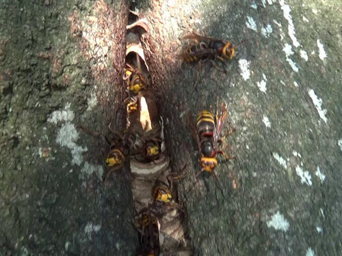 巨木の樹洞からモンスズメバチが出入り(福島市)