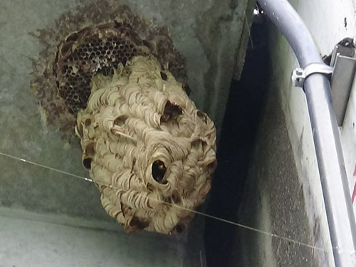 2階の隅の壁間に越冬を終えたモンスズメバチの女王蜂が最初に作り始めた巣(母巣)がありました。この母巣が家族が増えて窮屈になったために同じ家屋で10mほど離れた1階の軒裏天井に引っ越しました。