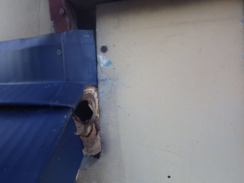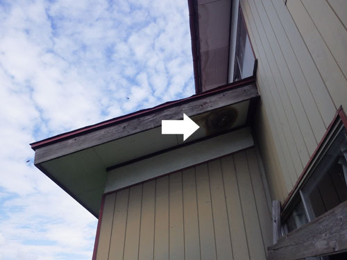軒先がちょっと朽ちて隙間ができています。その隙間からモンスズメバチが頻繁に出入りしています(8月上旬)。このような場合は軒裏天井に巣を作っていることが多いです。軒裏に穴をあけると大きなモンスズメバチの巣が軒裏天井にありました。