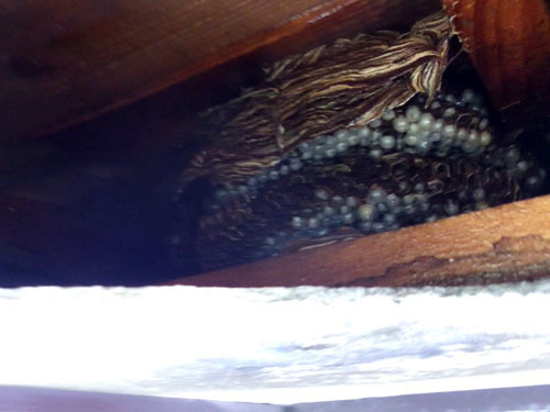 軒下の古い巣の中にモンスズメバチの巣(郡山市)