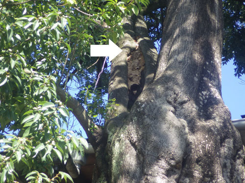 家の裏にある巨木の樹洞からモンスズメバチが頻繁に出入りしていました(10月中旬)。その樹洞の全体が目張りされています。目張りを取り除いて巣の場所を探ると、モンスズメバチたちの出入り口よりも上方の樹洞に巣の本体がありました。